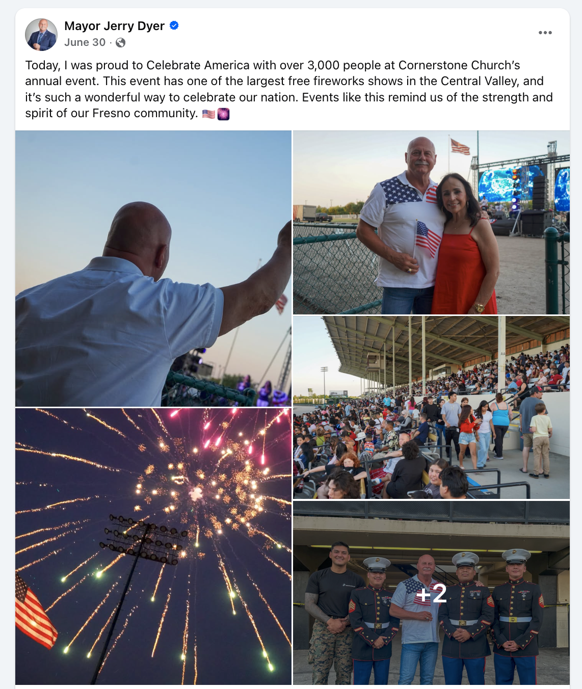 On his official Facebook page, Fresno Mayor Jerry Dyer shared a photo of himself attending Cornerstone Church’s ‘Celebrate America: One Nation Under God’ event, which promoted itself as the largest free fireworks show in the Valley. “...I was proud to Celebrate America with over 3,000 people at Cornerstone Church’s annual event. This event has one of the largest free fireworks shows in the Central Valley, and it’s such a wonderful way to celebrate our nation. Events like this remind us of the strength and spirit of our Fresno community,” said Mayor Dyer on Facebook.