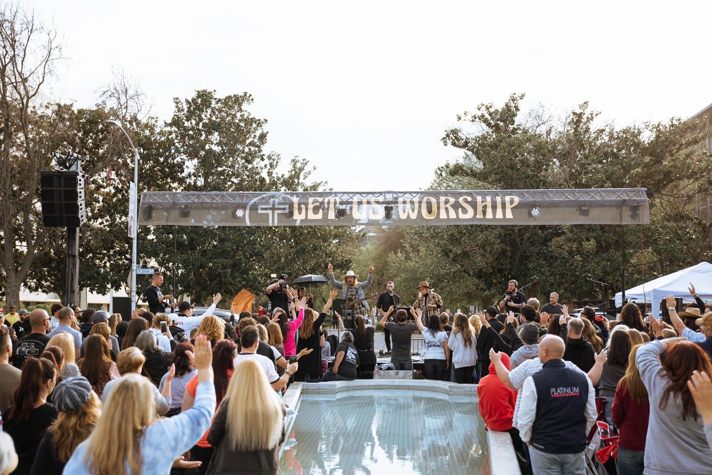 Photo of Sean Feucht in front of Fresno City Hall “Let Us Worship” event.