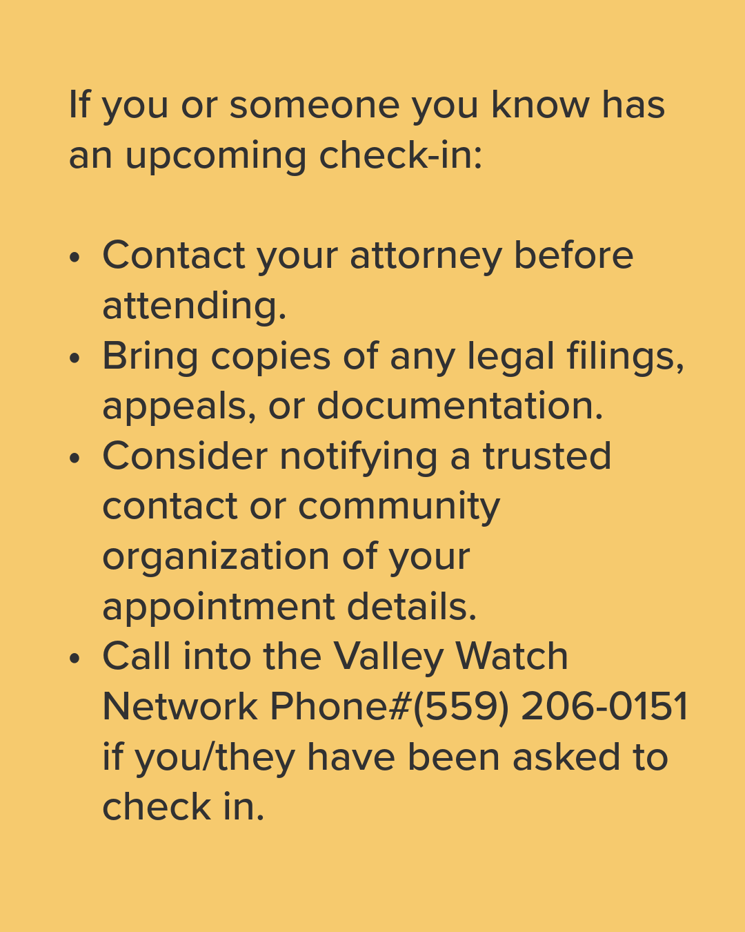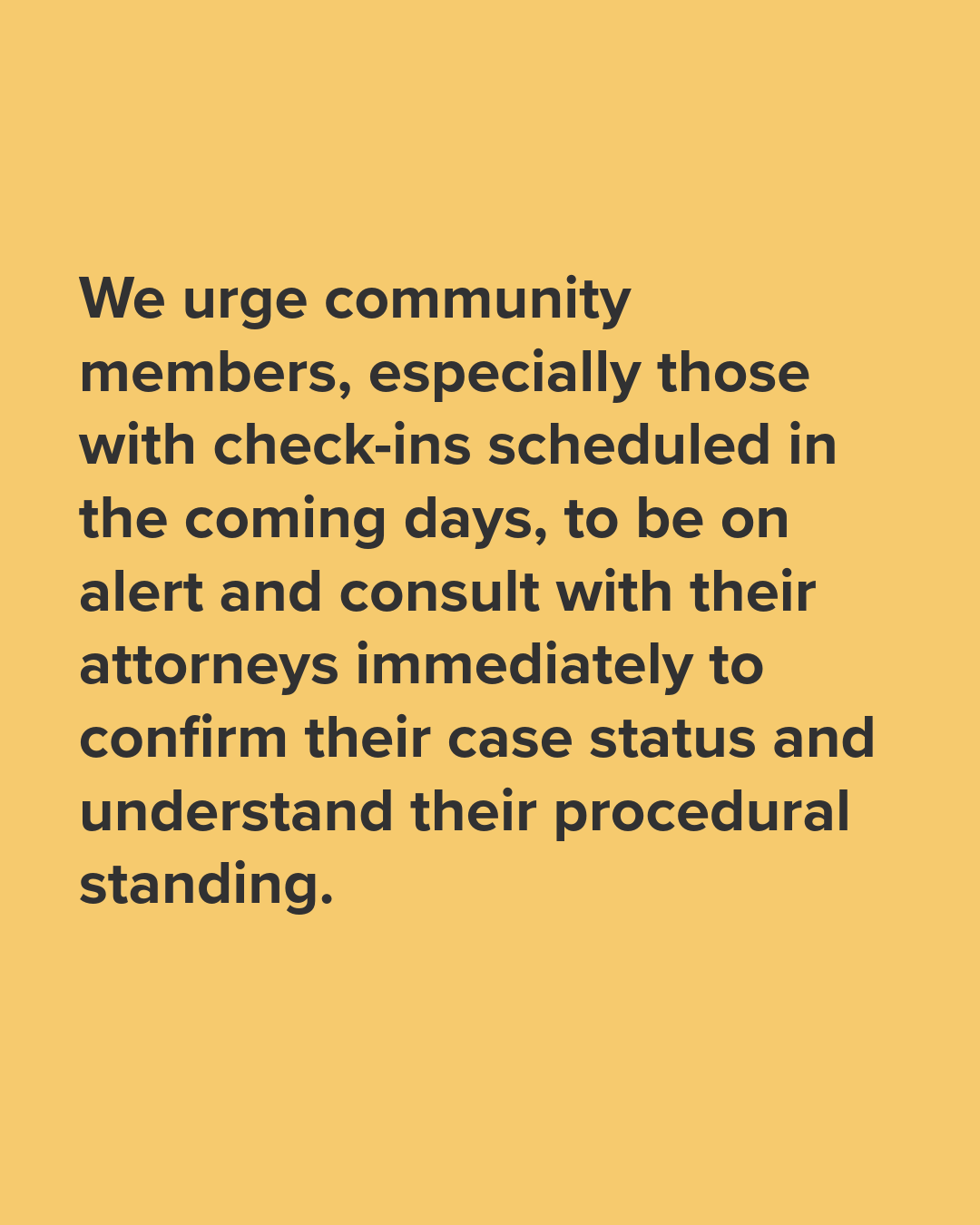 We urge community members, especially those with check-ins scheduled in the coming days, to be on alert and consult with their attorneys immediately to confirm their case status and understand their procedural standing.â