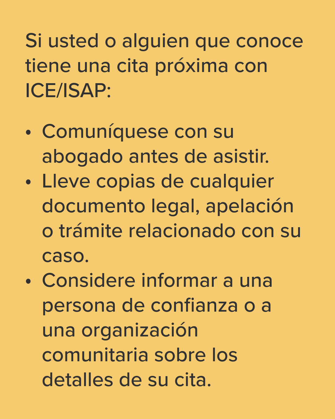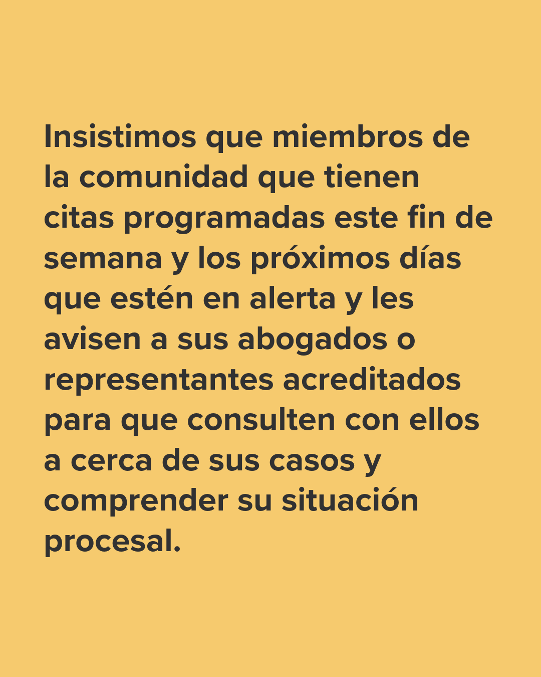 Insistimos que miembros de la comunidad que tienen citas programadas este fin de semana y los prĂłximos dĂas que estĂŠn en alerta y les avisen a sus abogados o representantes acreditados para que consulten con ellos a cerca de sus casos y comprender su situaciĂłn procesal.â