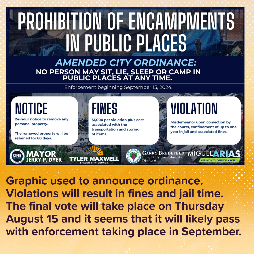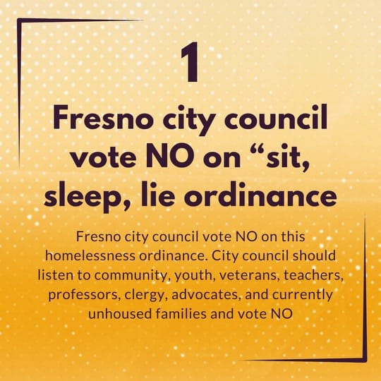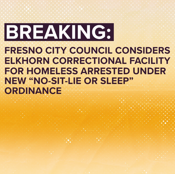 For example on Thursday 15th we posted late breaking news to our socials, informing our followers of urgent and current developments: Our friends over at the Central Valley Community Action brought this to our attending. During today’s Fresno City Council meeting, they will be discussing purchasing the Elkhorn Correctional Facility located in Caruthers for those arrested under the “NO-SIT-LIE OR SLEEP” ordinance. This will take place during a closed session meeting. Closed session meetings are not open to the public but are still listed in the city council meeting agenda.