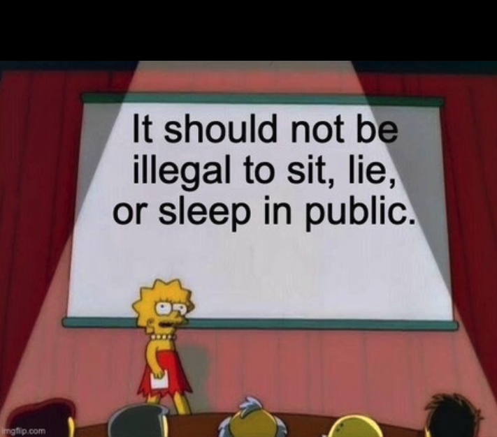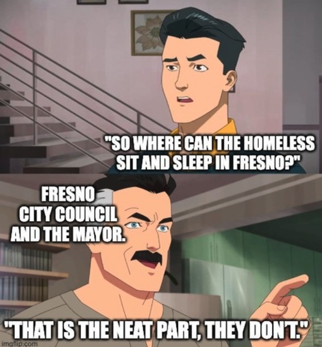Caption that came along with meme: More harsh punishments are coming for those that don’t have a place to live. Fresno City Council and the mayor made it illegal to sit, lie, and camp in public spaces. Our street families will face fines and/or jail times. Advocates have consistently said there aren't enough beds in shelters to accommodate our unhoused community. So what is the game plan here? Are we turning our local jail into a homeless shelter now? Spending millions of taxpayer dollars to criminalize poverty? Share your thoughts in the comments.