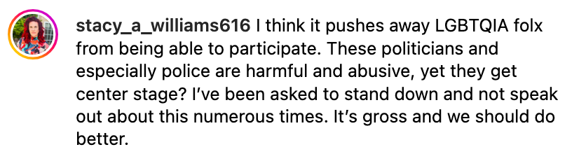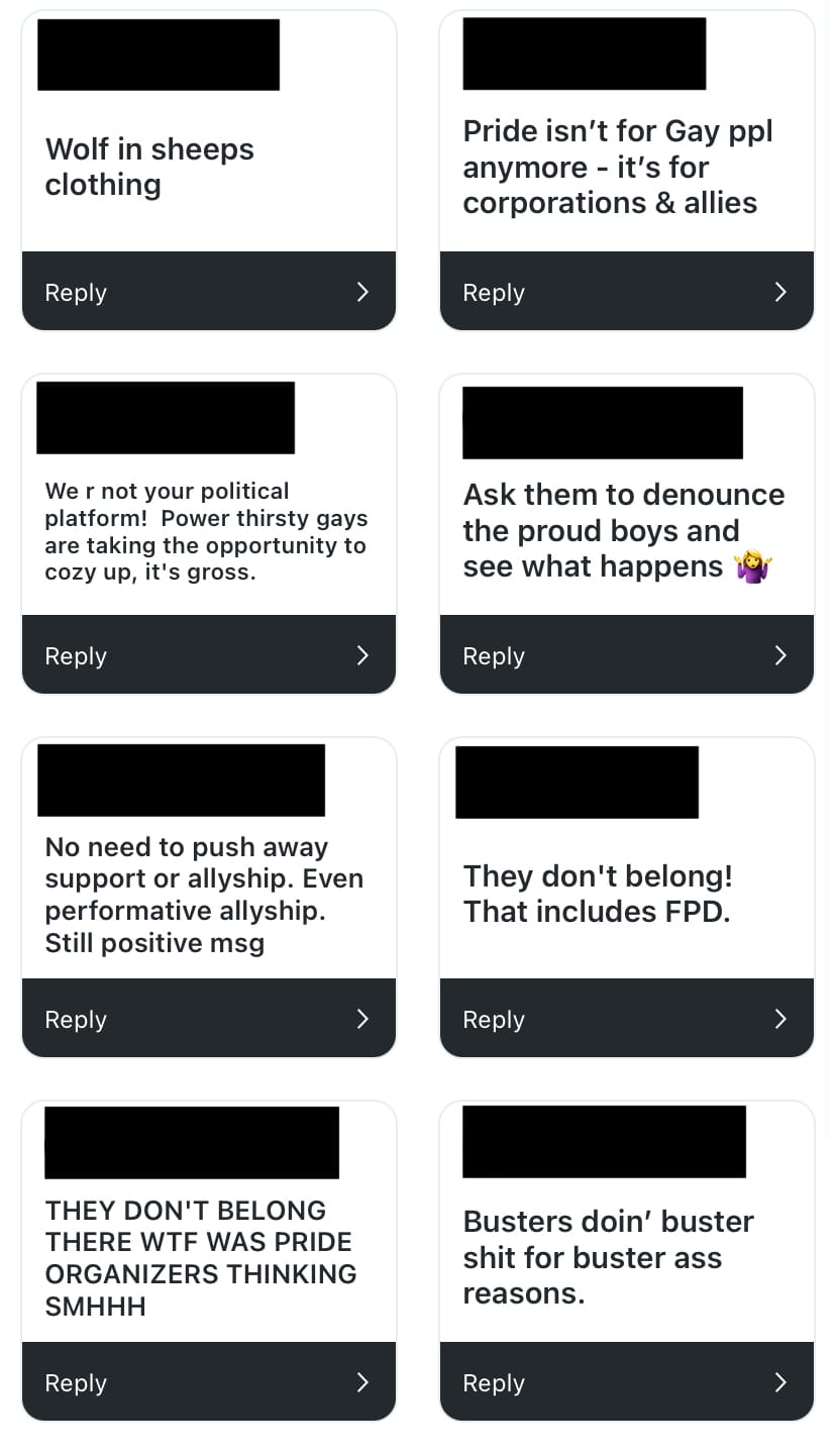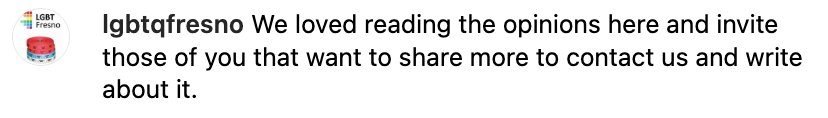 On our Instagram Stories we did a Q&A, asking our followers "What are your thoughts about these groups showing up for Pride?," and received 14 responses while each answer varied, the common sentiment was clear: our followers do not want to see organizations like the Fresno Police Department at Pride. On Instagram Stories our followers can submit their answers anonymously. Below are just a sample of their responses.