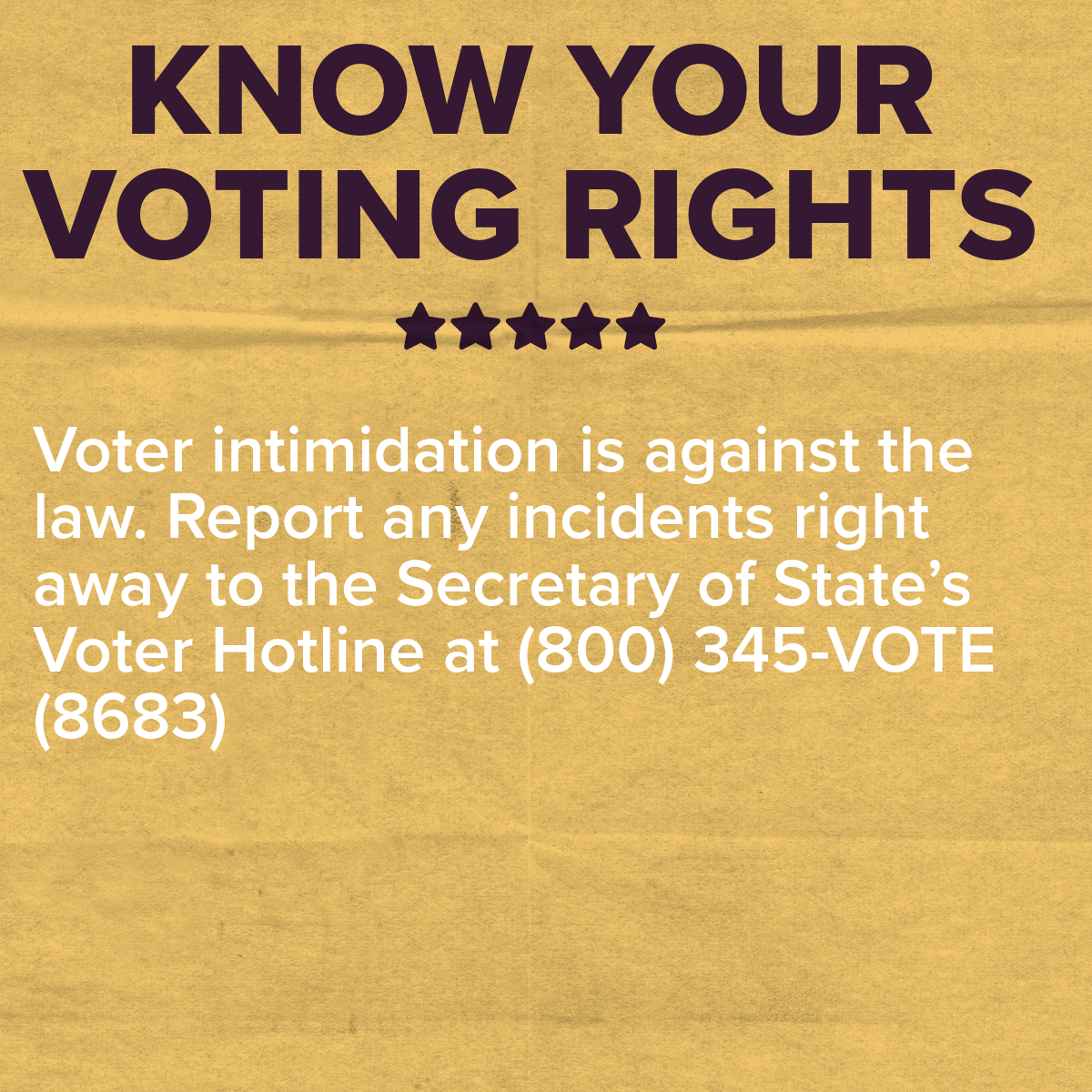 Know your rights before you head to the polls! Voter intimidation is against the law. 📢 Report any incidents right away to the Secretary of State’s Voter Hotline at (800) 345-VOTE (8683).