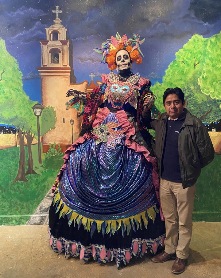 “My mom’s facebook profile, is a picture of her with Claudio and La Catrina.”, says local artist Mauro Carrera. A modern gesture of love and respect by Mexican mothers in the digital era. Carrera has known Valencia and Martinez for close to a decade. A picture of Carrera and La Catrina from 2018 captioned “Vibing with La Katrina” has a permanent home on his instagram feed. Inspired by the way the couple care for La Catrina through their art, Carrera calls their work “medicinal.” Carrera reflects on the importance of La Catrina del “VALLE” (valley) and its meaning to the local Mexican immigrant community.