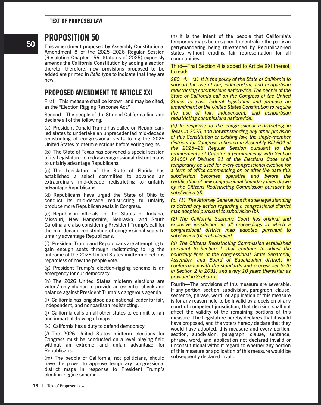 Prop 50 temporarily amends article XXI of the California Constitution to allow the state legislature, not the CCRC, to draft the emergency redistricting map. The temporary map intentionally favors the Democrats to hopefully recover the 5 seats lost from the new Texas maps.