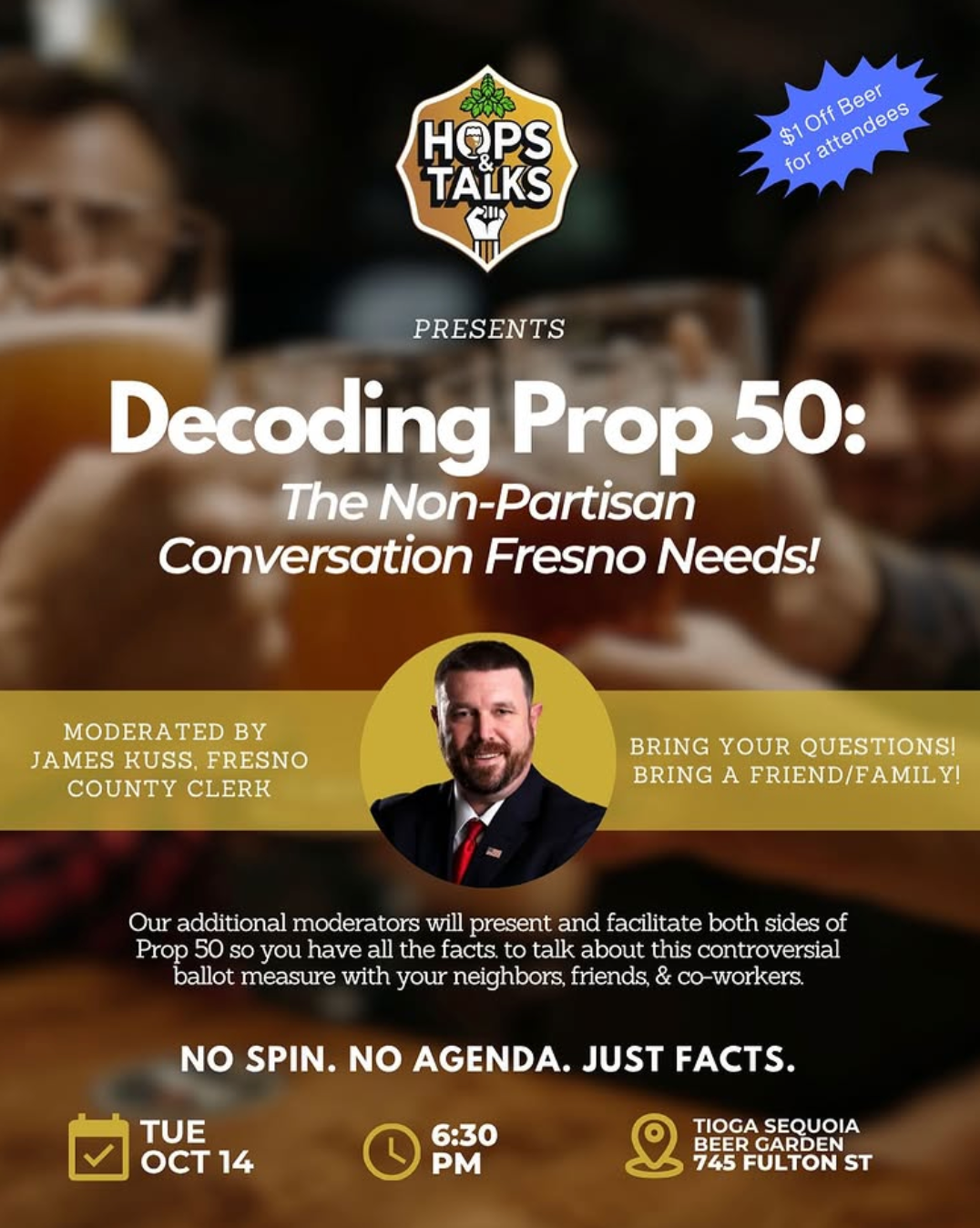 On October 14, 2025 dozens of Fresnians gathered at Tioga Sequoia Beer Garden for a non-partisan informational session and discussion about Prop 50. The free event, part of an ongoing series called Hops and Talks, featured Fresno County Clerk James Kuss.