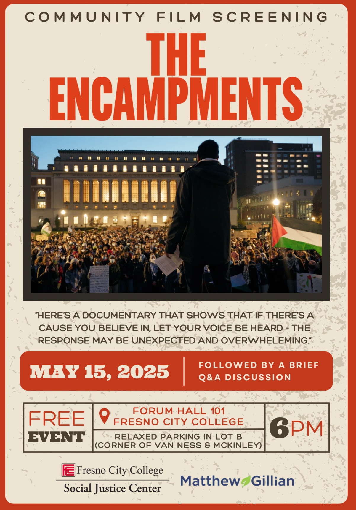 On Thursday May 15th, a special screening of the documentary The Encampments will be taking place at Fresno City College. The Encampments is a documentary about the courageous action taken by Columbia University students who demanded that their university divest from U.S. and Israeli weapons manufacturers. Their action sparked Palestine solidarity encampments across the country.