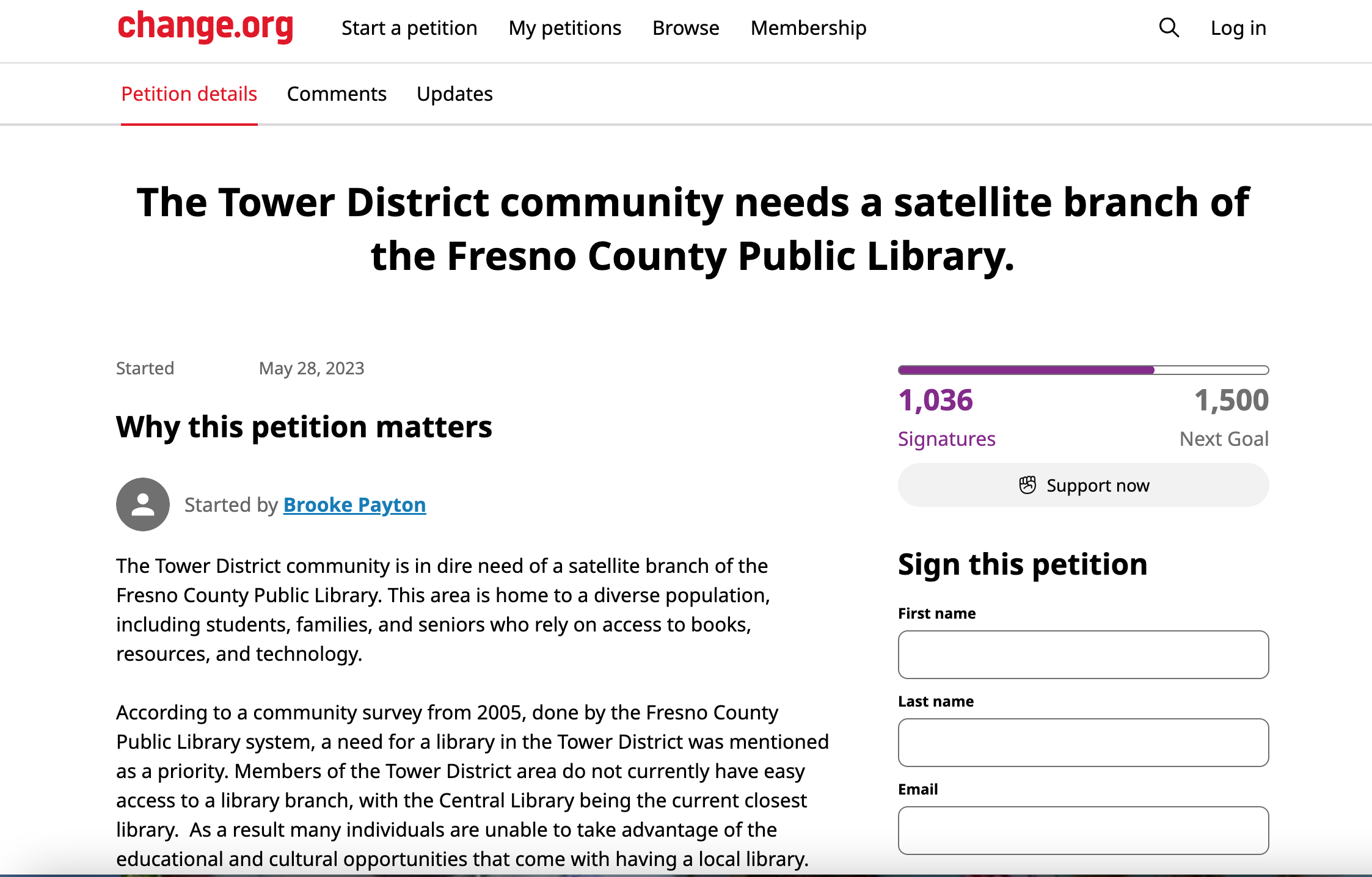Brooke Payton ran a successful campaign to ensure local Tower bar, Spokeasy Public House, could keep their backyard. After the campaign, she knew that there was momentum and a need behind bringing a library to the Tower District. The TowerLibrary.org website was created, it includes historical documents of the original library spaces, a community survey, petition, donation link, as well as resources that libraries offer communities. The aim of the website is to build an understanding of what a library in Tower would provide residents and what libraries bring in general to the community.