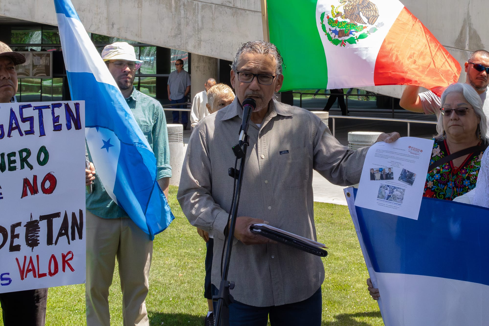 On June 26, 2025, labor and immigrant rights advocates met outside Fresno City Hall for a press conference condemning the recent and ongoing wave of unconstitutional Immigration and Customs Enforcement (I.C.E.) and Border Patrol actions and calling on local businesses to stand with immigrant communities.