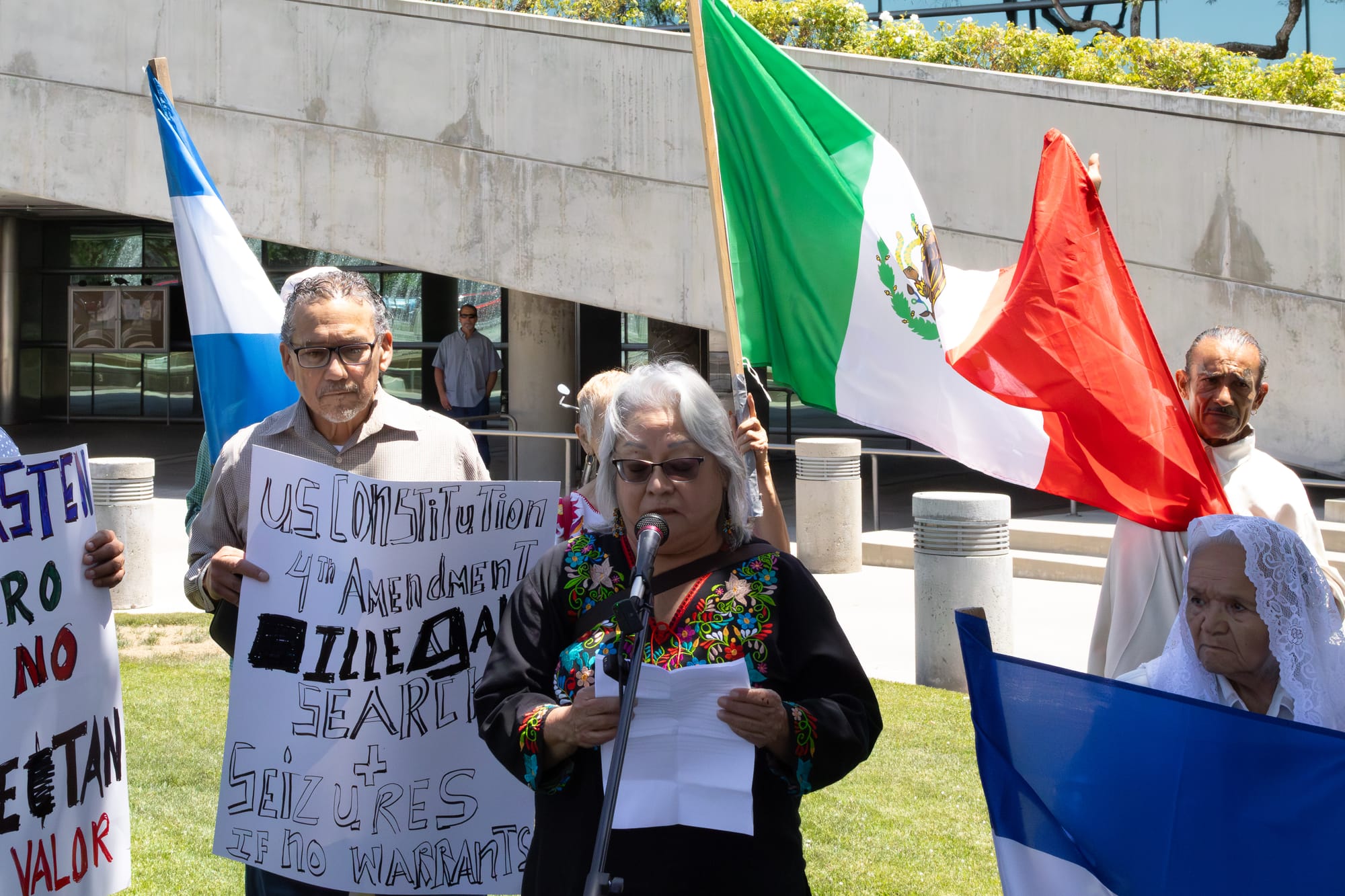 The speakers emphasized violations of the U.S. Constitution, particularly the Fourth Amendment’s protection from illegal search and seizure. Activist Gloria Hernandez cited a recent court ruling in UFW v. U.S. Border Patrol, which prohibits warrantless arrests and requires documentation of enforcement actions.