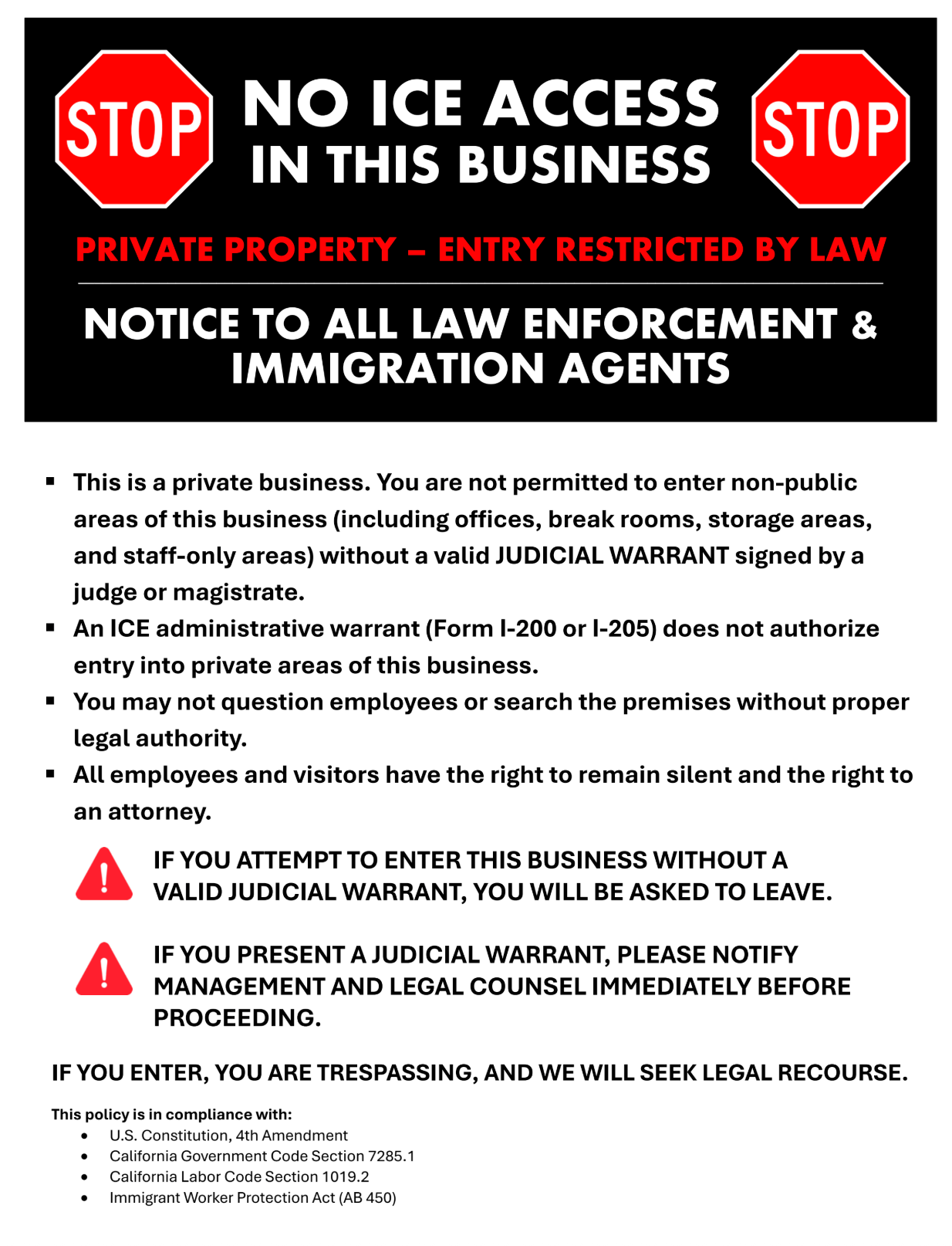 Speakers also highlighted that businesses and immigrants should be viewed as "one community" and that business owners have constitutional rights to refuse random searches on their private property, suggesting this could help maintain economic stability in the region.